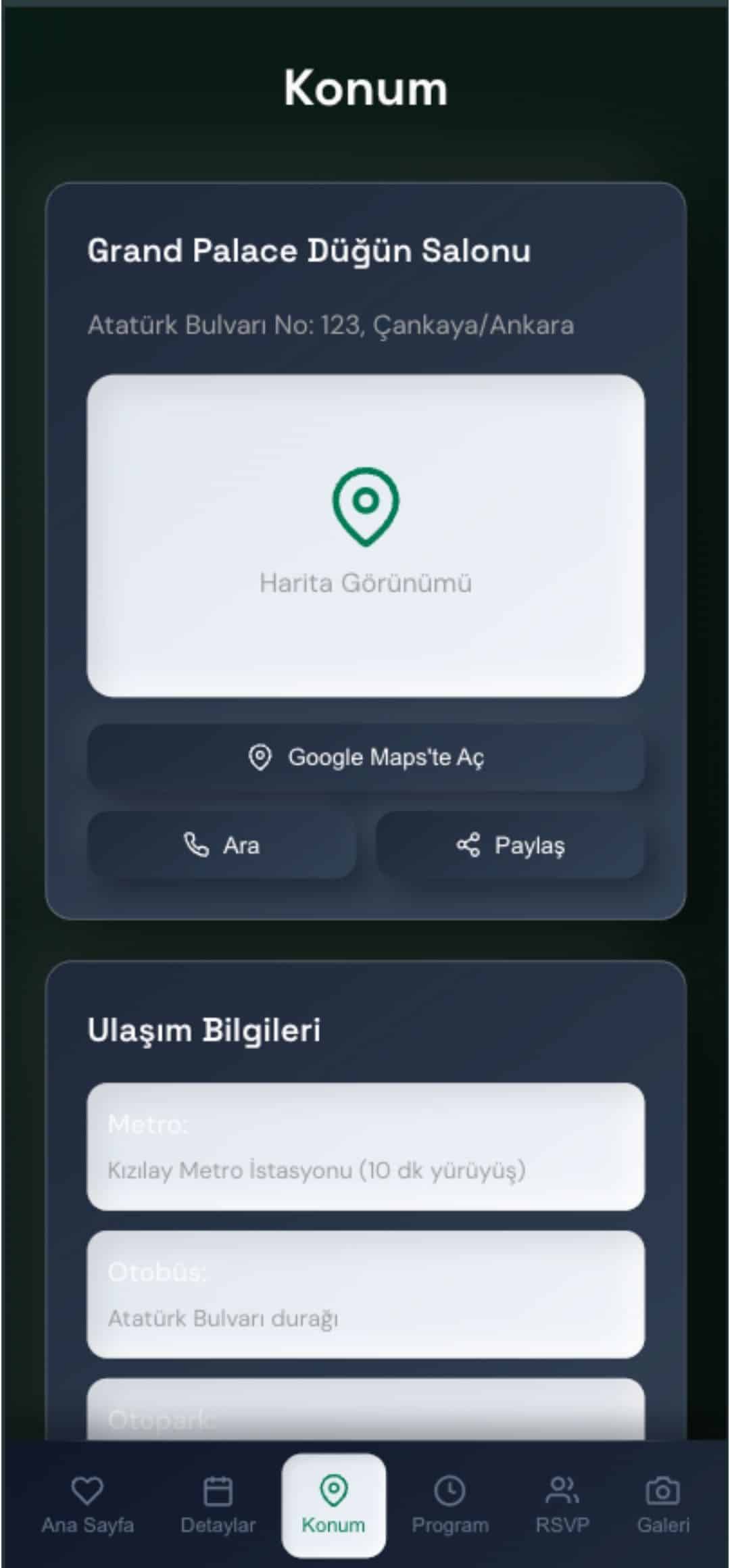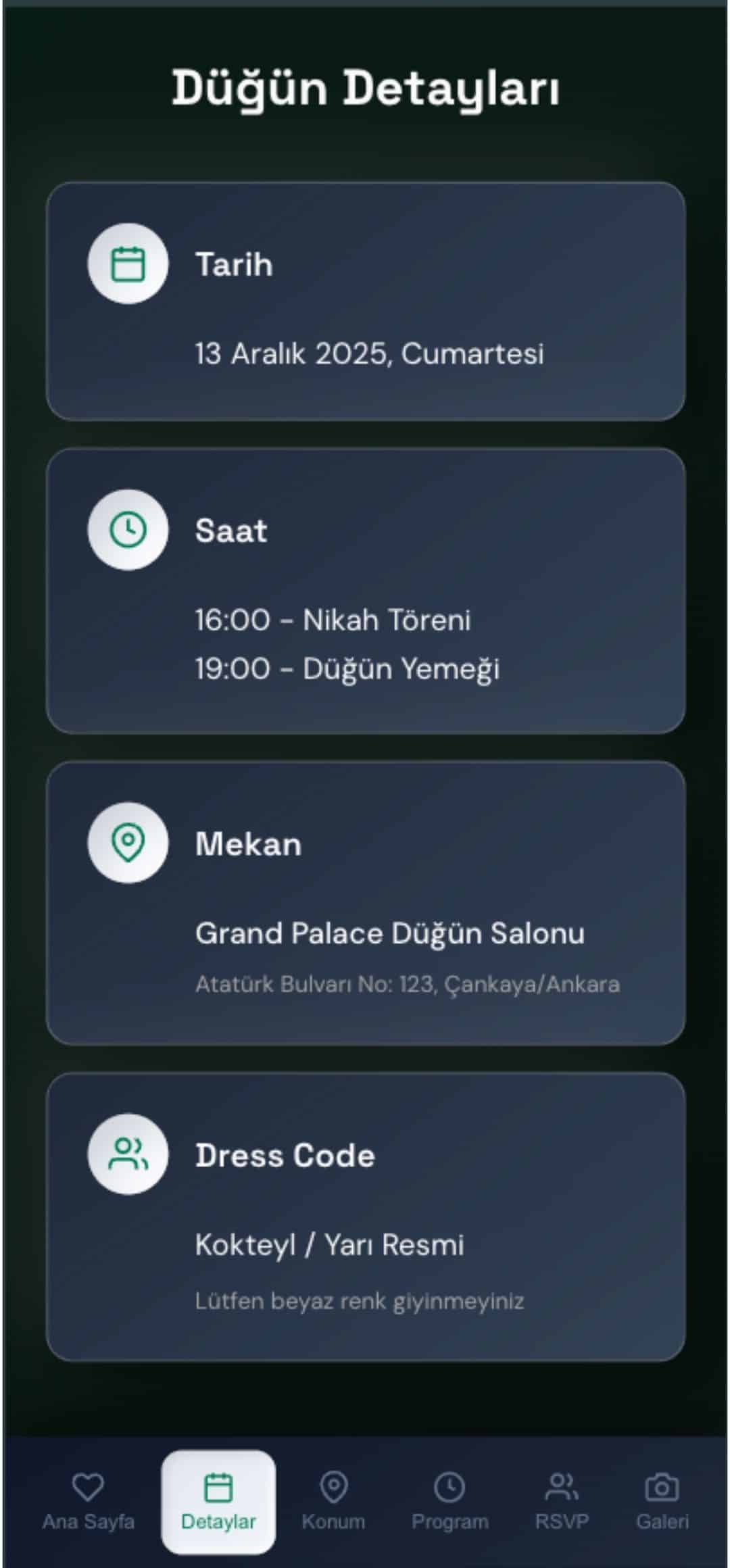 - Kullanıcı; konum, saat, RSVP formu gibi tüm detaylara anında ulaşır